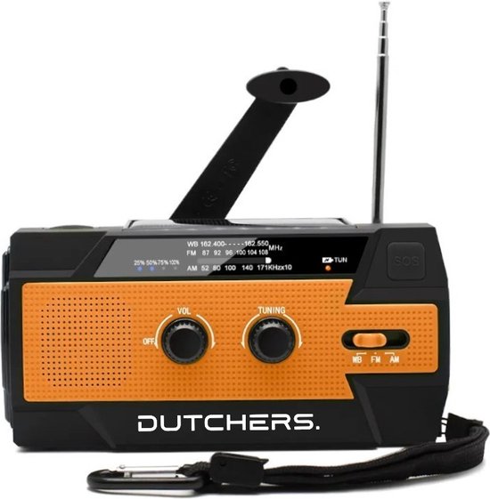 - Dutchers Noodradio is een compacte en waterdichte (IPX3) radio met AM/FM/NOAA-functies voor noodupdates en avonturen.